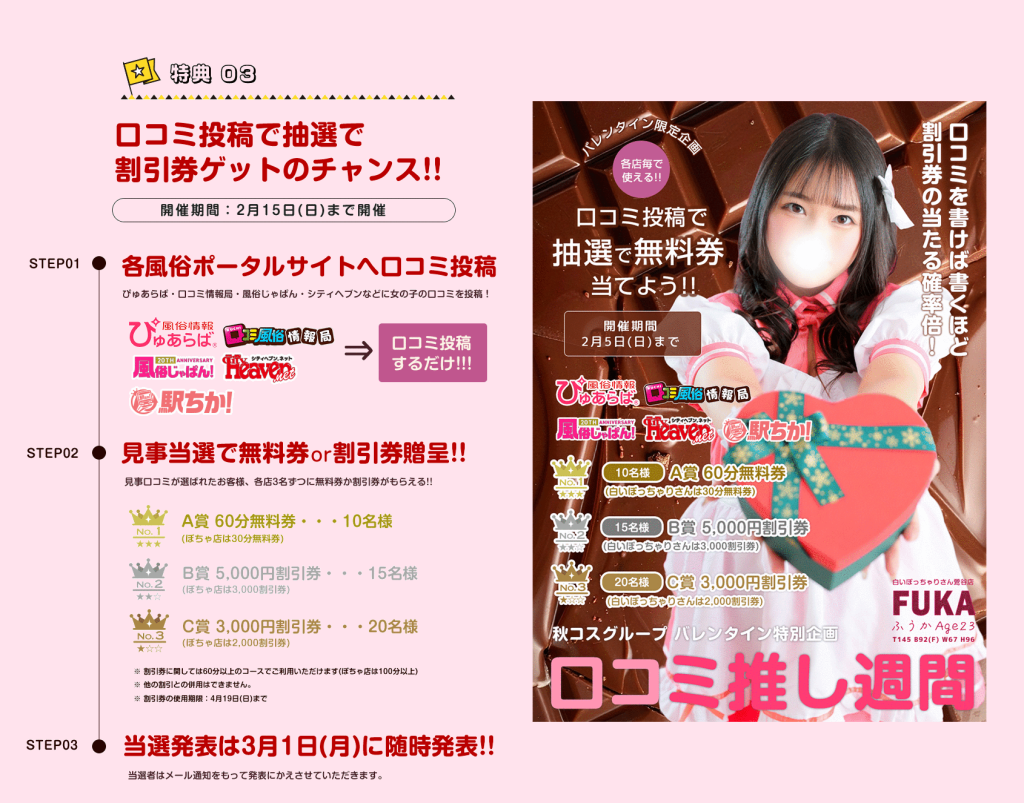 期間中(2/6~2/15)各風俗ポータルサイトへ口コミ投稿!